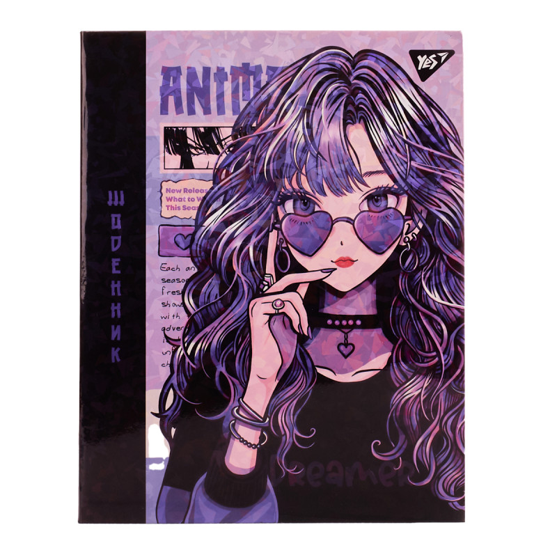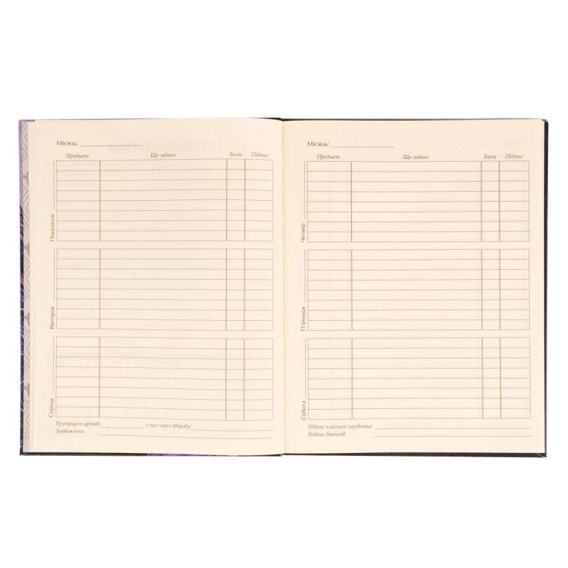 Щоденник для школи формат 170 x 212 мм., інтергальна палітурка з щільного картону. Внутрішній блок з кремого офсетного паперу щільність 70г/м2. Щоденник включає в себе сторінку з особистими даними учня, список вчителів, розклад уроків, канікул та іспитів, відомості про успішність, план на навчальний рік. Інформаційний блок: табель, розклад уроків, списки вчителів, розклад факультативних занять. Виробник ТМ YES.