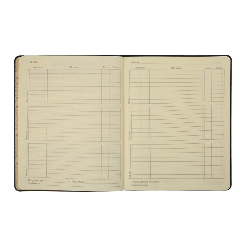 Щоденник для школи формат 170 x 212 мм., інтергальна палітурка з еко-шкіри. Внутрішній блок з кремого офсетного паперу щільність 70г/м2. Щоденник включає в себе сторінку з особистими даними учня, список вчителів, розклад уроків, канікул та іспитів, відомості про успішність, план на навчальний рік. Інформаційний блок: табель, розклад уроків, списки вчителів, розклад факультативних занять. Виробник ТМ YES.